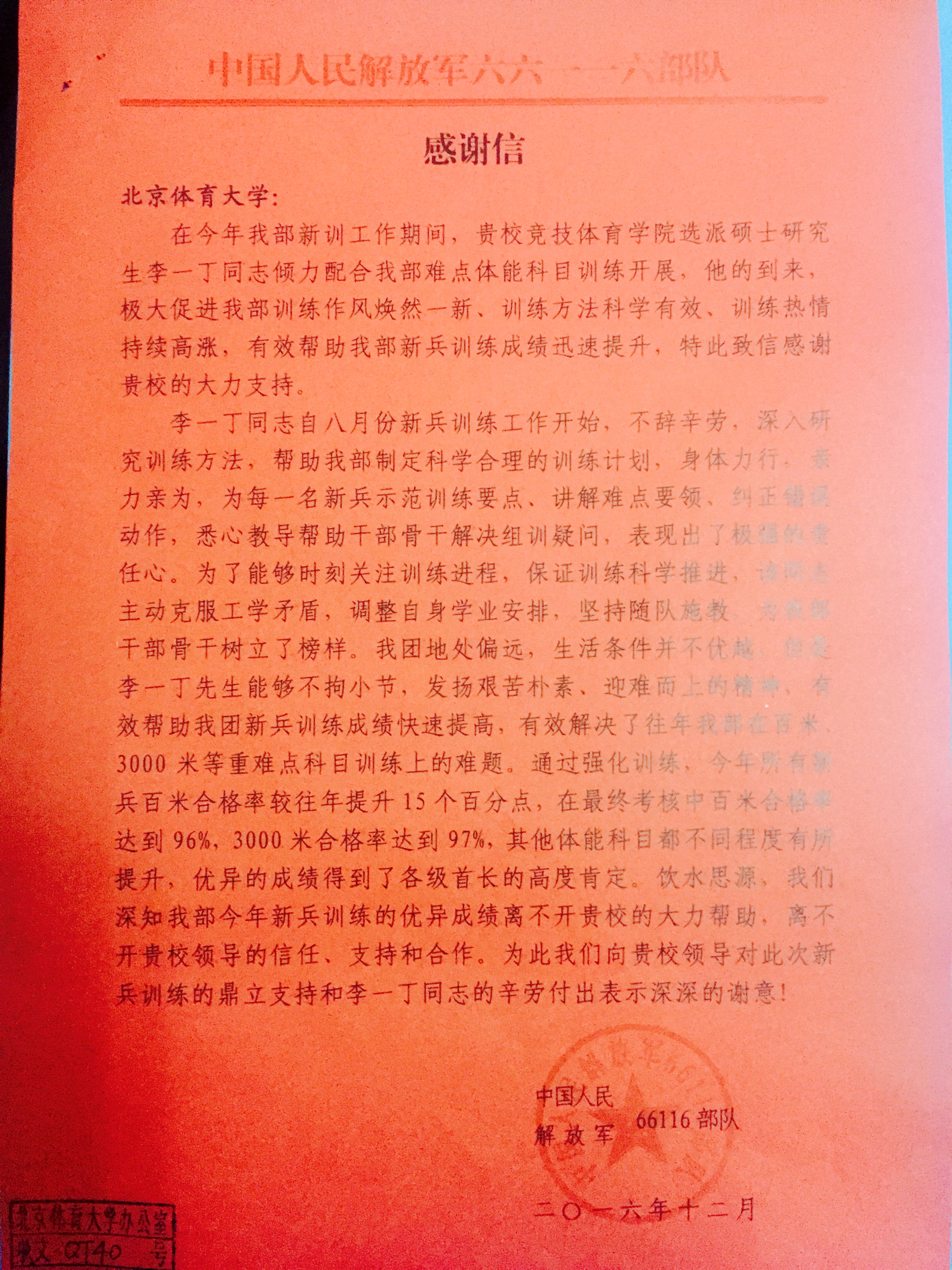 信中对beat365配合解放军66116部队难点体能科目训练的硕士研究生李一丁同学表示感谢。在工作中体现出的不辞辛劳,身体力行,亲力亲为等光荣品质。为其部干部骨干树立了优秀的榜样,为此解放军66116部队对我校领导和李一丁同学的辛劳付出表示深深的谢意。