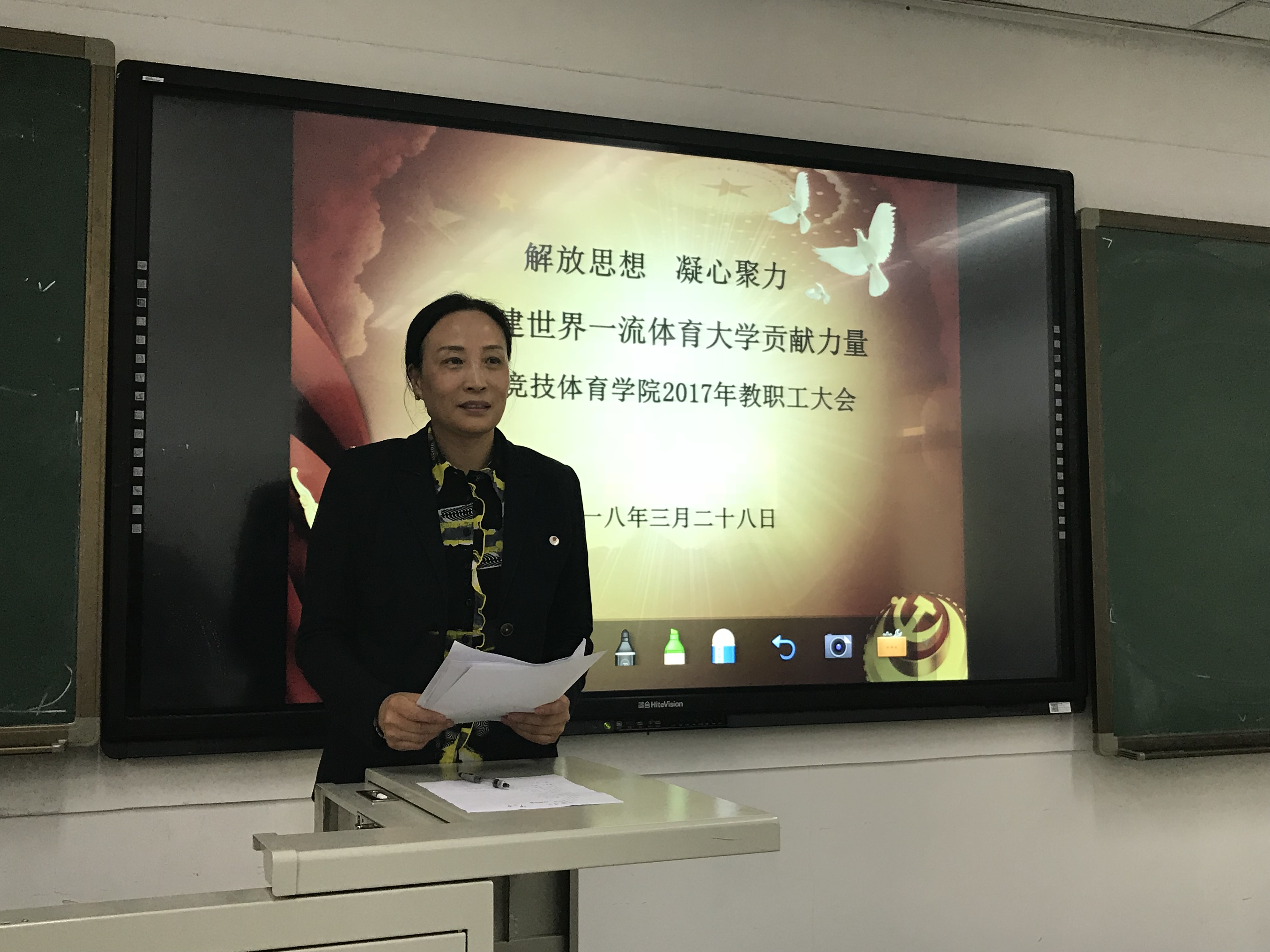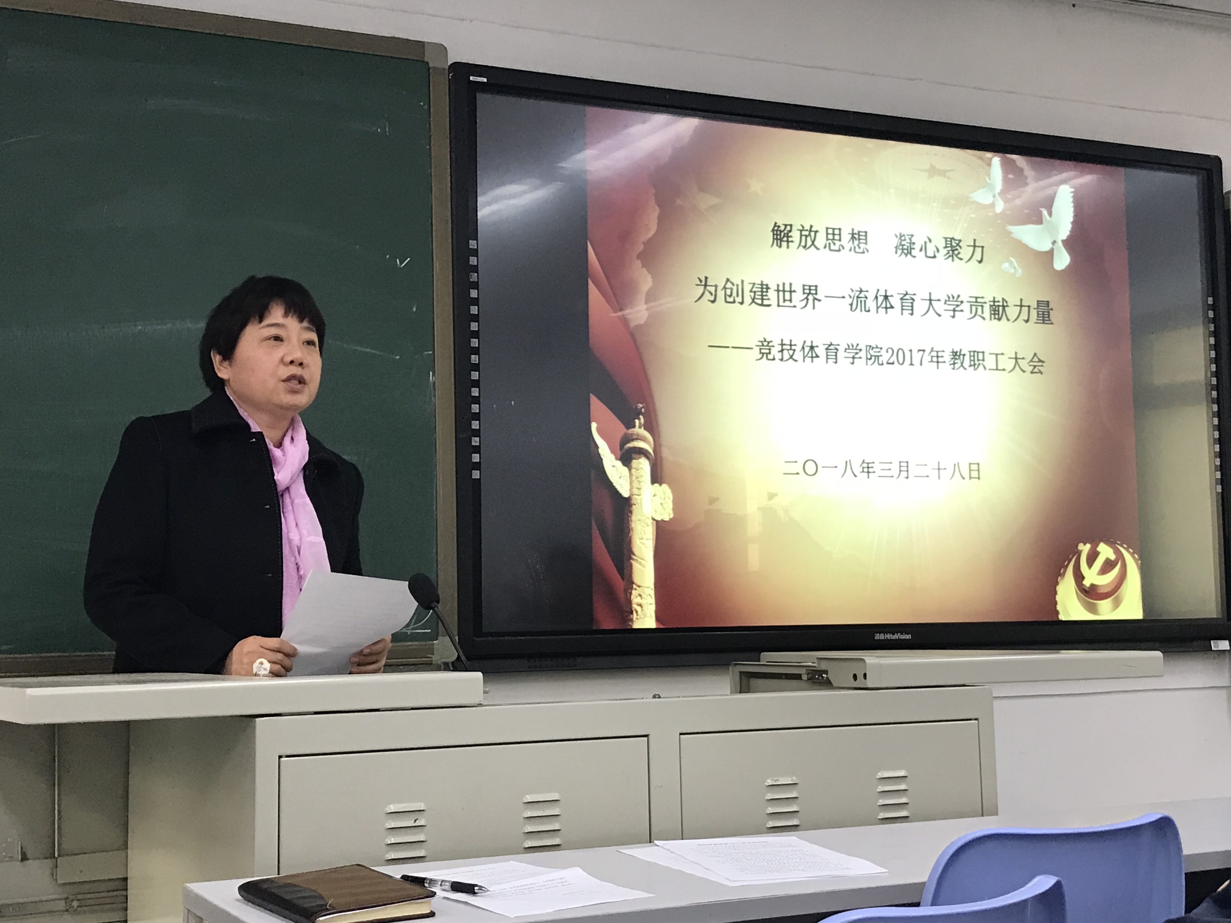 2018年3月28日,beat365手机版官网召开了以“解放思想,凝心聚力,为创建世界一流体育大学贡献力量”为主题的教职工大会。学院分工会主席尚迎秋、院长马冰、副院长左琼及全体教师参加了会议。