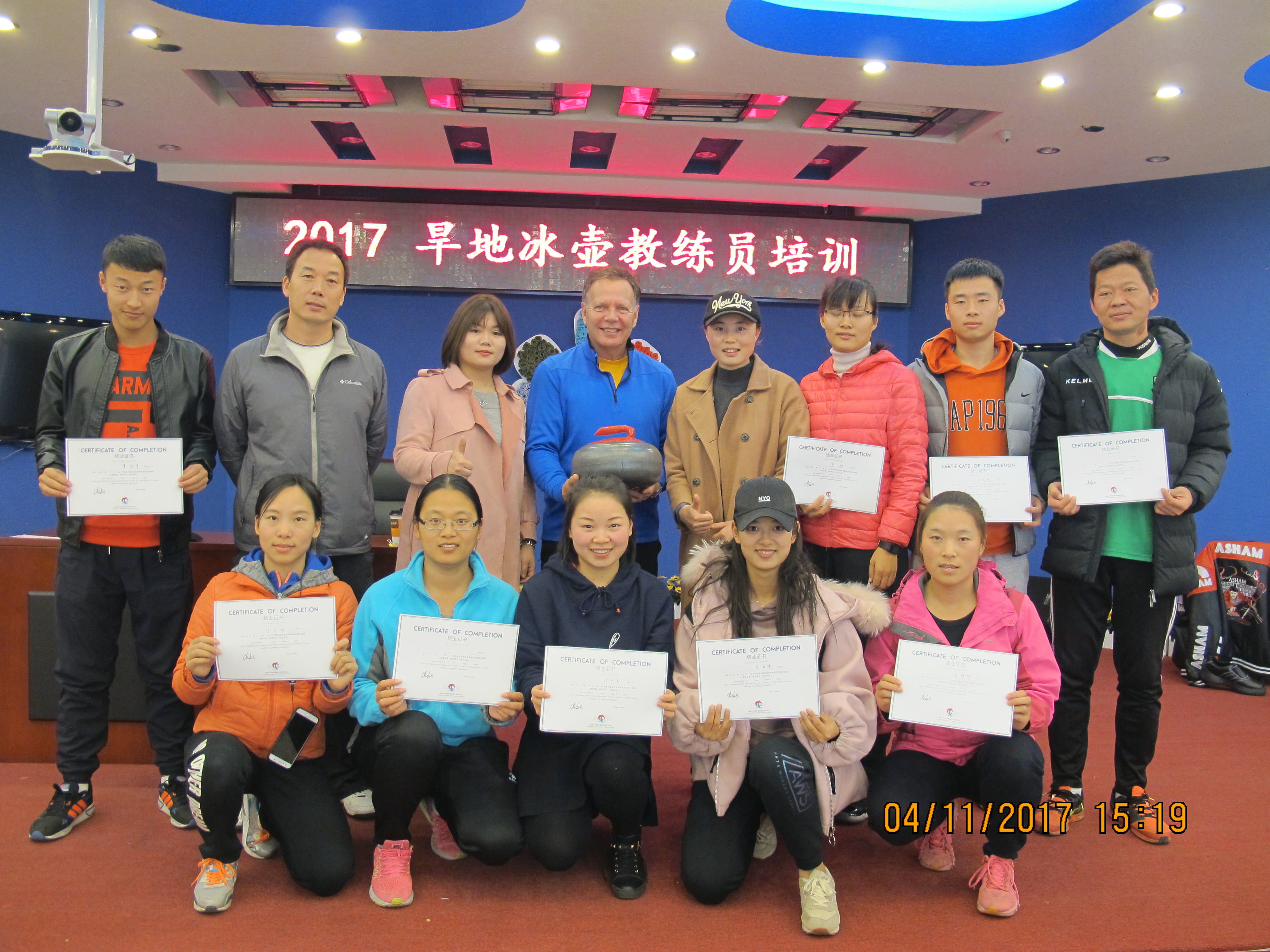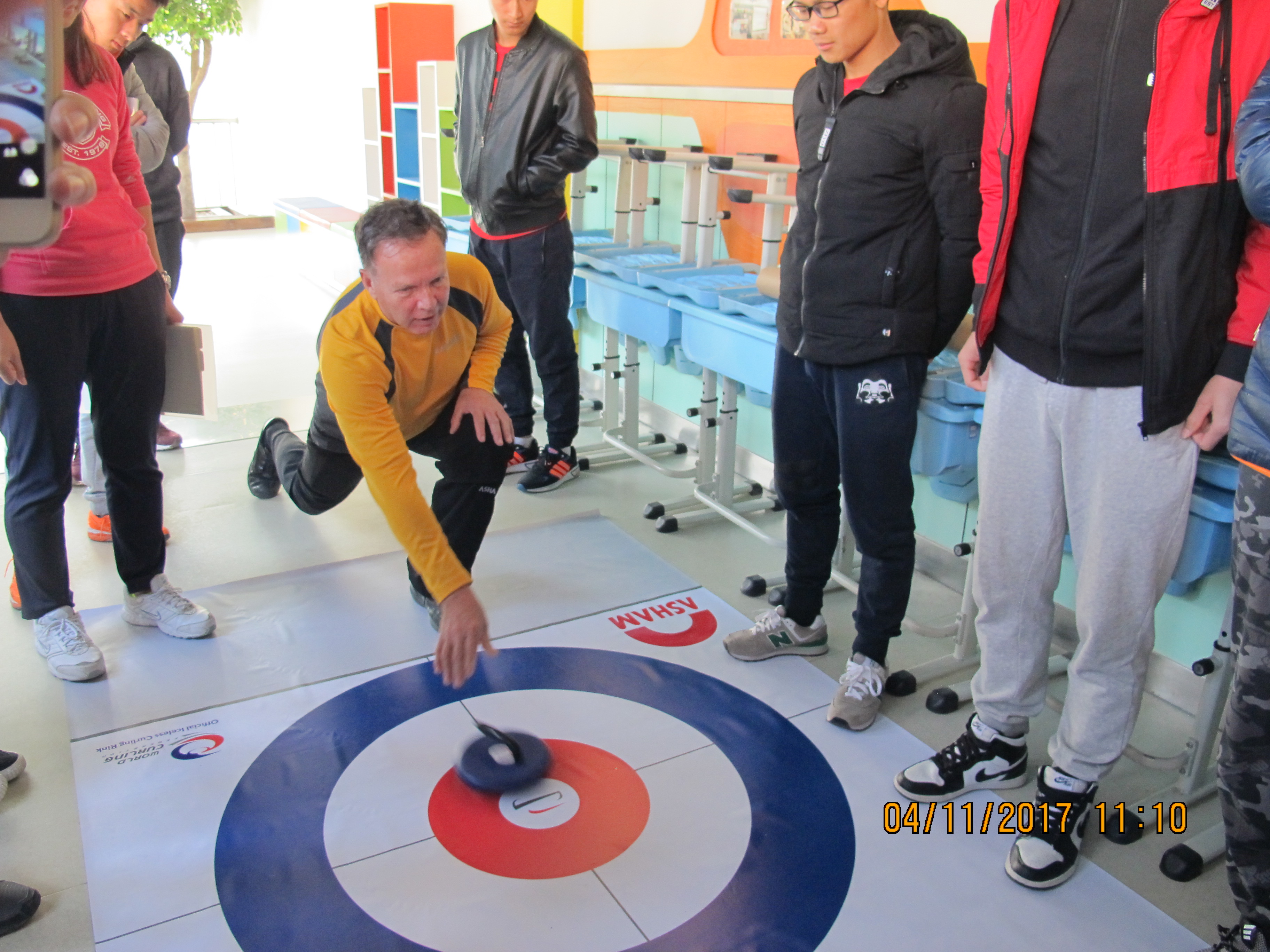 另外,此次旱地冰壶教练员培训还邀请了加拿大专业冰壶教练Terry Gibb先生,他围绕旱地冰壶的发展史、普及现状和器材构造规则展开了讲座。Terry Gibb教练将他丰富的理论知识通过新颖生动的讲解方式传达给了每位在座学员:从旱地冰壶到冰壶项目,从理论到切身实践,简明易懂、趣味横生的讲座让大家对旱地冰壶这一在中国并未普及开来的项目有了更直观的了解和感知。参加培训的学员们不但听的入迷,在遇到重要的知识点和问题时也不忘记录下来。讲座之后,他还亲自组织参加本次培训的教练员进行了一次旱地冰壶友谊赛,并为优胜选手准备了精美的纪念品。