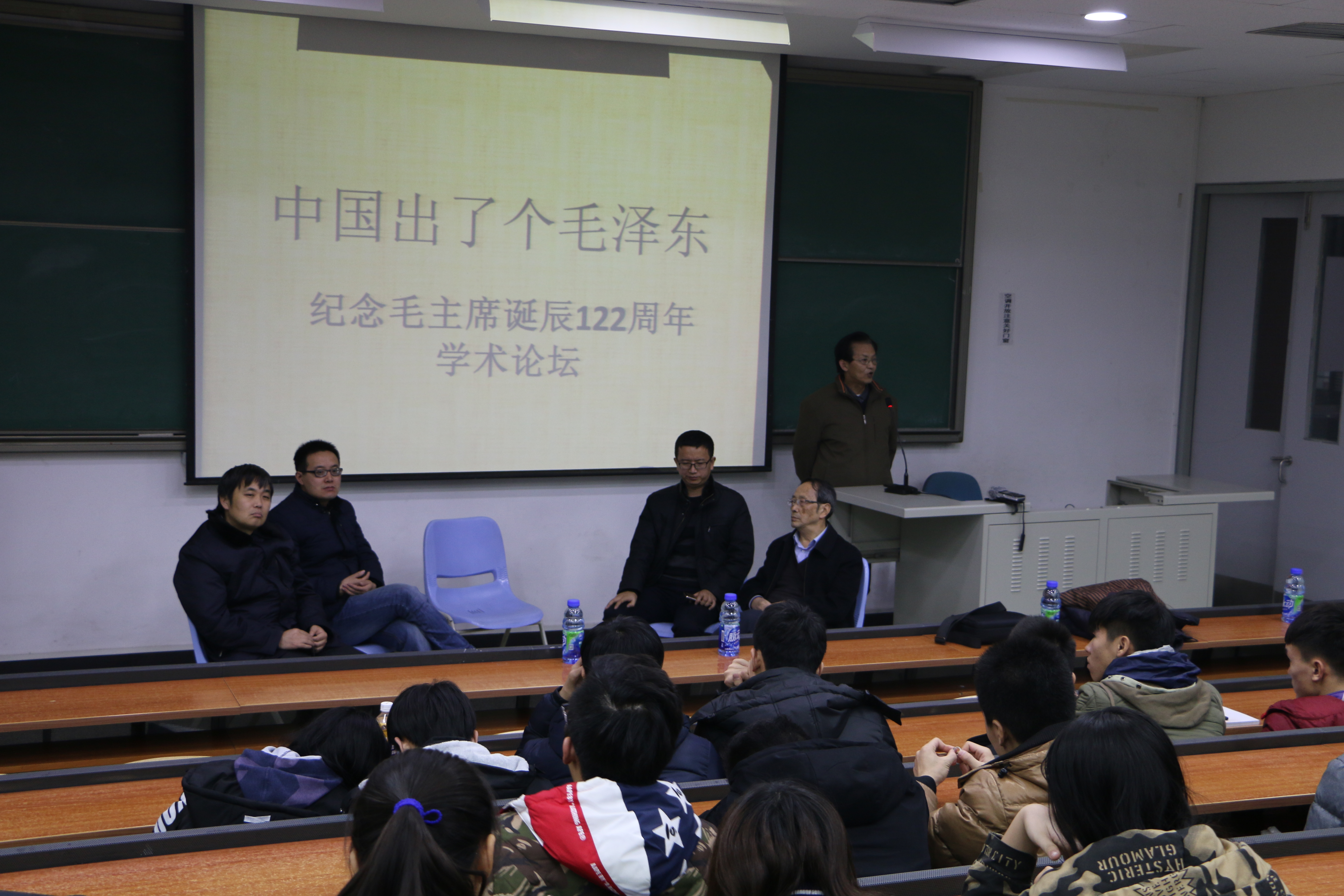 2015年12月23日晚7:30,由beat365手机版官网举办的红色文化教育讲座暨纪念毛主席诞辰122周年文化讲座在教学楼314教室顺利举行。前来演讲的分别是北京城郊经济研究所所长张文茂、中国红色文化研究会理事任黎明、北京第二外国语学院法政学院国际政治系讲师徐亮、北京科技大学马克思主义学院教授左鹏。本次活动旨在让大学生们纪念我们伟大的人民领袖毛泽东,谨记毛主席为新中国缔造和建设的丰功伟绩。
