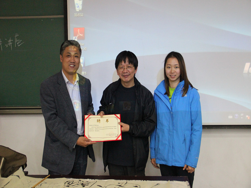 讲座开始前,著名书法家王民德先生向在场学生展示其创作时的视频,并在讲座中分享自己对书法书写的经验与独到的见解。讲座中王民德先生提到了书法作为一种汉字文化的意义与价值、书法艺术对于传承文化的意义以及对建筑及雕塑艺术的影响、古书法与当代书法的区别、书法的发展过程等方面,并阐述对当代书法艺术价值的观点。王先生认为,书法是文字造型的艺术,是书法运动的艺术,通过力量、速度、变化带来的节奏是书法艺术的核心。王先生说道,自己是一名狂热的体育迷,所以,在进行书法创作时,常常会将书法与体育艺术相结合。他认为,毛笔运动如同运动员在赛场上的表演,从速度和力量中变化出的节奏能够赋予书法作品更多的灵性。讲座结束后,王民德先生为在场学生做现场演示,亲自示范书法笔法,其动作行云流水、一气呵成,使在场师生无不赞叹先生的书法功底与艺术造诣。