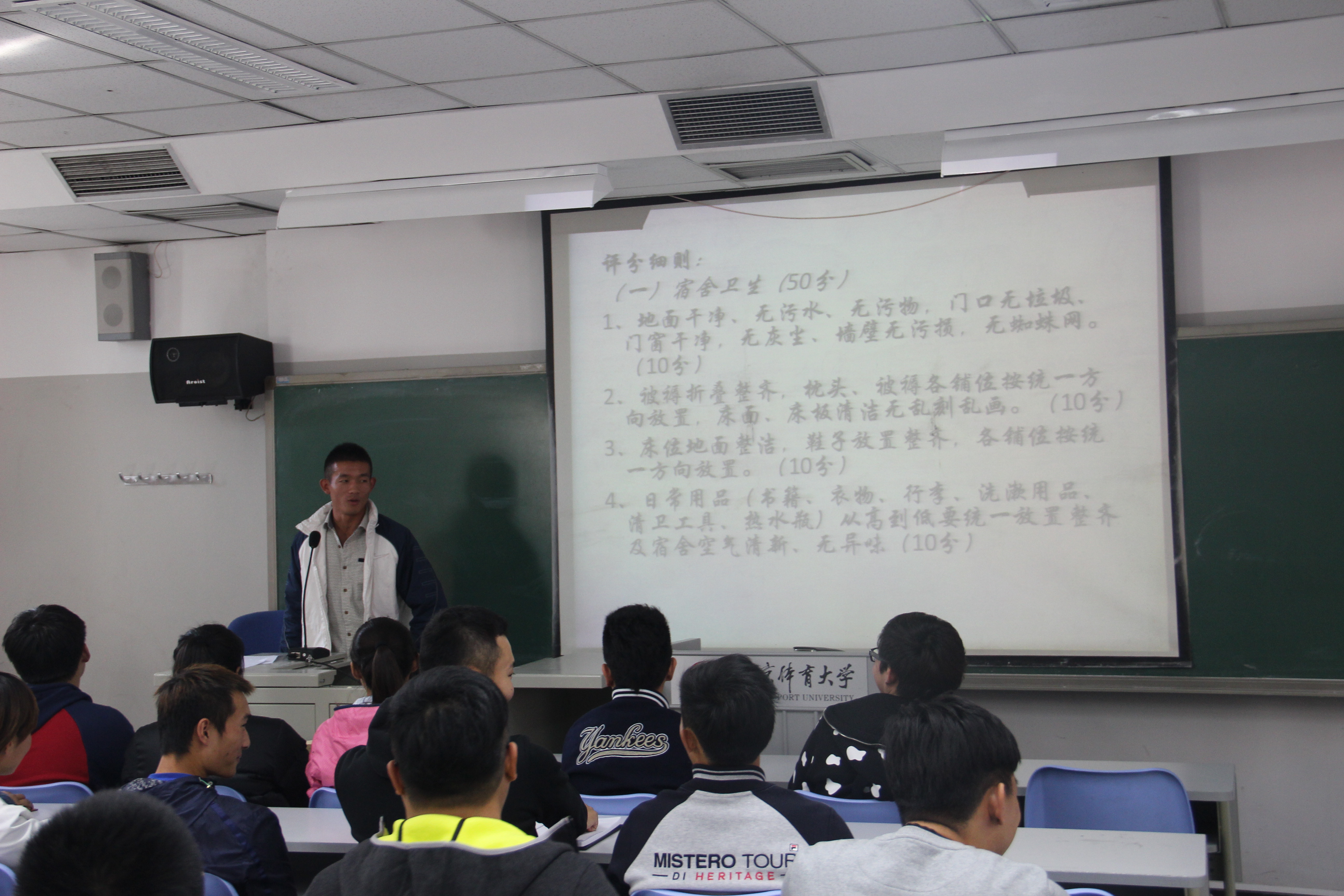 会上鲁骥老师指出,宿舍安全作为学生安全的重要组成部分,应受到高度重视,2015级要将学生教官纳入年级日常管理中,使学生教官的作用常态化。随后田家成详细介绍宿舍评比办法,包括日程安排,评分细节,宿舍要求以及评选办法。最后军训教官代表黄国龙表示,军训教官会全力配合学生进行日常工作管理,希望通过自己的努力,把部队的优良传统带给学生。