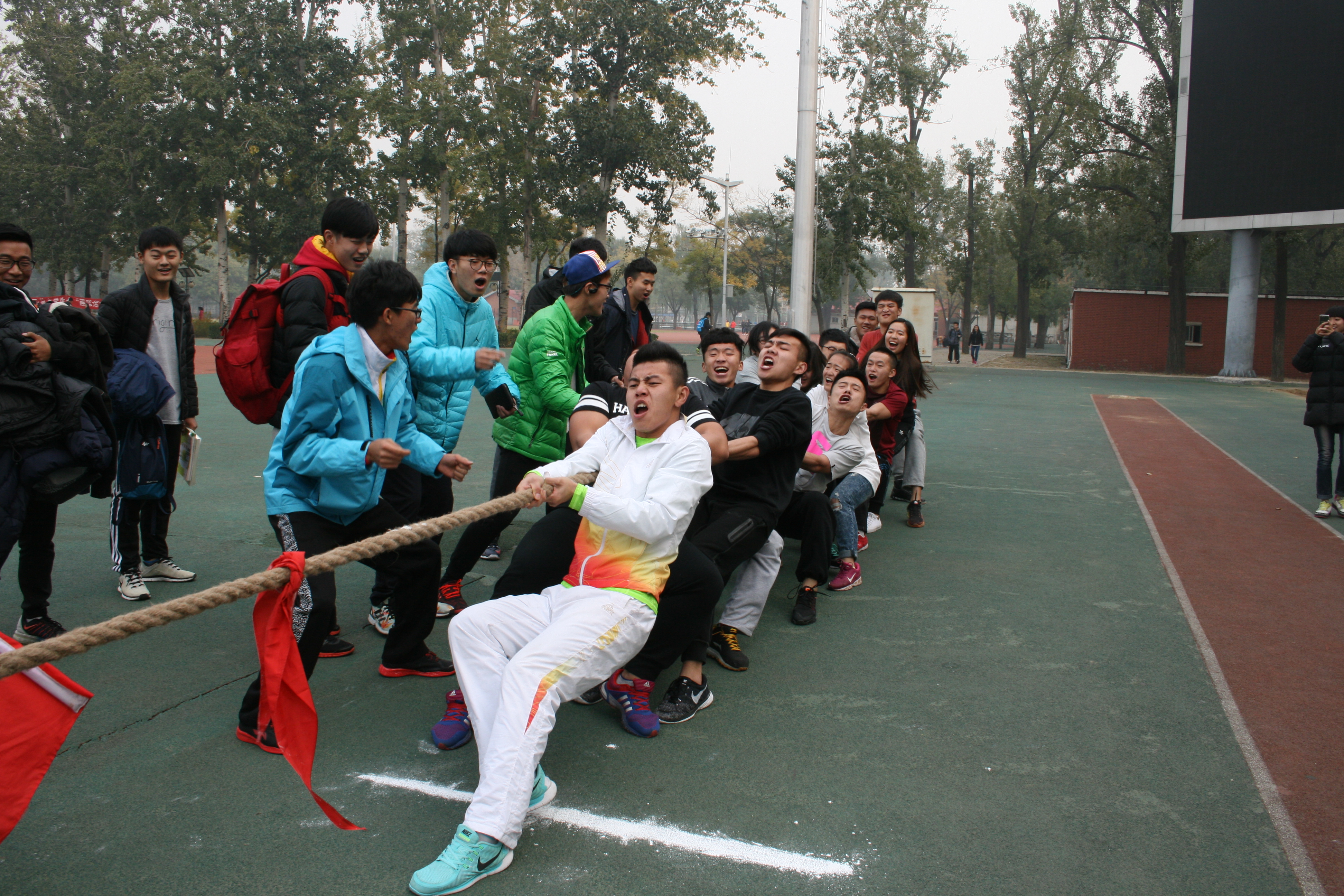 2015年11月4日12:00整,拔河比赛正式开始,每个班级都选拔出了最具实力的队员。只见比赛场上,各班级同学互相加油鼓劲。每个班级都不断的想出更好的方法去拔河并且都在不断的喊着口号,为了最后的冠军拼搏。
